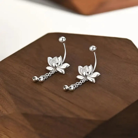Vintage Style 925 Sterling Silver Lotus Tassel Stud Earrings – Hypoallergenic Floral Design with Synthetic Stone