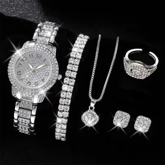 6PCS Luxury Women’s Watch & Bracelet Set – Elegant Crystal Design